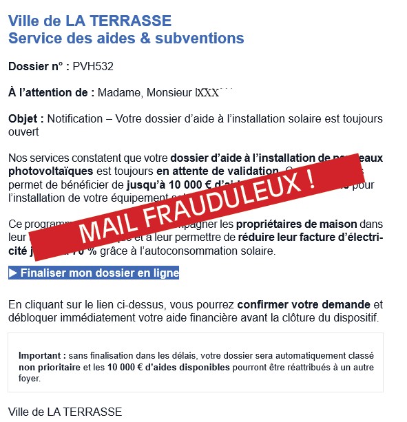 Si vous recevez ce type d’e-mail, nous vous alertons sur le fait que la Ville de la Terrasse ne subventionne pas les panneaux photovoltaïques !